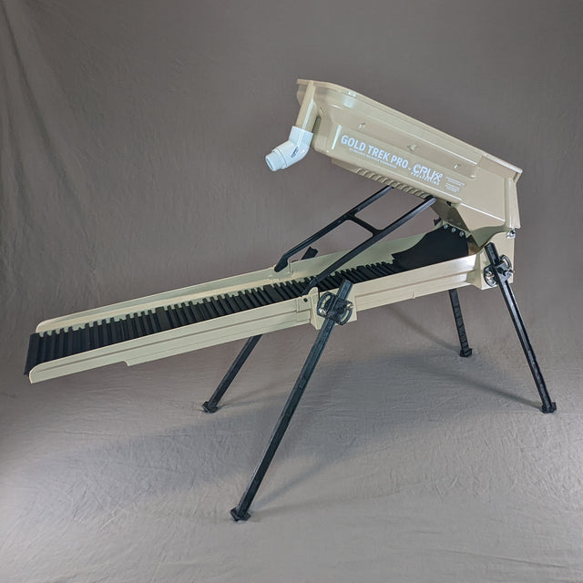 - Efficient Gold Capture: 36" sluice box with textured V‑groove hopper floor, a damper flap and Crux Drop Riffle Sluice matting for ultra fine gold recovery